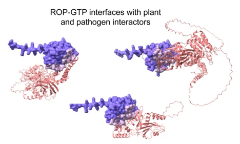 The ROP GTPase RACB has been co-immunoprecipitated with two host phospholipid-metabolizing enzymes and one fungal effector that influences pathogen interaction. All three modeled protein complexes share an overlapping binding interface with RACB. [The Plant Journal]