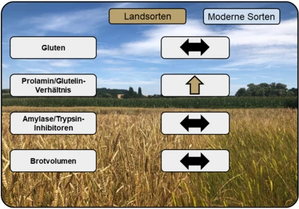 Der Proteingehalt war bei den Weizenlandsorten geringfügig höher als bei den modernen Weizensorten, die als Vergleich dienten. Die Gehalte an allergenen Amylase/Trypsin-Inhibitoren unterschieden sich in den beiden Gruppen nicht, ebenso wie die inhibitorische Aktivität. Zwar waren die Gehalte der Gliadine in den Landsorten höher, jedoch die der Glutenine niedriger, weswegen sich beim Glutengehalt als Summe kein Unterschied ergab. Die Hypothese, dass Landsorten weniger immunreaktive Inhaltsstoffe enthalten als moderne Sorten konnte somit im Rahmen dieses Projektes nicht bestätigt werden. Die verschiedenen weiteren Analysen zeigten, dass sich Landsorten kaum in der Zusammensetzung der Inhaltstoffe von modernen Sorten unterscheiden. Dies wurde auch in der Praxis deutlich, da selbst Sorten, die zu flüssigen oder klebrigen Teigen führten, durch die richtige handwerkliche Handhabung (z.B. lange Teigruhe) gut zu Produkten wie Brot, Kleingebäck oder Nudeln verarbeitet werden können. Durch eine gute Vernetzung entlang der Wertschöpfungskette und mit Hilfe der ausgearbeiteten Marketingstrategien für verschiedene Zielgruppen haben die Getreidelandsorten ein großes Potential, eine Wiederentdeckung zu erfahren.