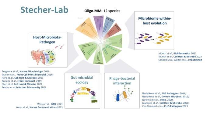 Der menschliche Magen-Darm-Trakt ist ein Ökosystem von unübertroffener Vielfalt. Mikrobielle Gemeinschaften, darunter Bakterien, Archaea, Eukaryoten und Viren, besiedeln den Darm und werden als Darmmikrobiota bezeichnet. Insbesondere die bakteriellen Mitglieder sind in ein ökologisches Netzwerk aus Kooperation und Konkurrenz eingebunden, insbesondere über ihre Stoffwechselprodukte, was einen enormen Einfluss auf die menschliche Gesundheit hat. Bei ansonsten gesunden Menschen ist die Mikrobiota meist in der Lage, die Besiedlung durch Darmpathogene in einem als Kolonisationsresistenz bezeichneten Prozess zu blockieren. Antibiotika, Immunsuppression und Entzündungen können jedoch die Kolonisationsresistenz stören und zu einem Ungleichgewicht der Mikrobiota führen, wodurch die Anfälligkeit für Infektionen mit Pathogenen erhöht wird. Eine gestörte Mikrobiota ist durch einen Rückgang der obligat anaeroben Arten und eine relative Anreicherung fakultativ anaerober Bakterien, insbesondere von Mitgliedern der Enterobacteriaceae, gekennzeichnet, was zu dem Begriff „Enterobacterial blooming” geführt hat. Aufgrund der enormen Vielfalt der Darmmikrobiota sind die Mechanismen, die die Kolonisationsresistenz steuern, d. h. die Interaktion zwischen Mikrobiota, Immunsystem des Wirts und Krankheitserregern, noch weitgehend unklar. Wir verwenden Bottom-up-Ansätze, ausgehend von Isolaten und definierten mikrobiellen Gemeinschaften, die wir sowohl in vitro als auch in gnotobiotischen Mäusen untersuchen können.